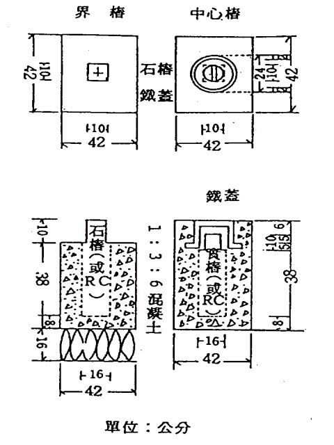 三、埋設:將樁安放於坑內,以經緯儀或十字樁校正樁位後固定之,次將1:3:6混凝土,沿樁之四周灌至坑深時校正樁位,使其準確正直,然後再用混凝土將坑填平。在現有道路中,樁頂鐵蓋宜與路面平;其餘地區以露出地面十公分為原則。埋設完竣後,再檢查樁位中心,其誤差應在五公釐以內。道路中心樁及其交點樁(IP)埋設在現有道路上時,為避免損壞及妨礙交通,應於樁頂之上加設鑄鐵護蓋。